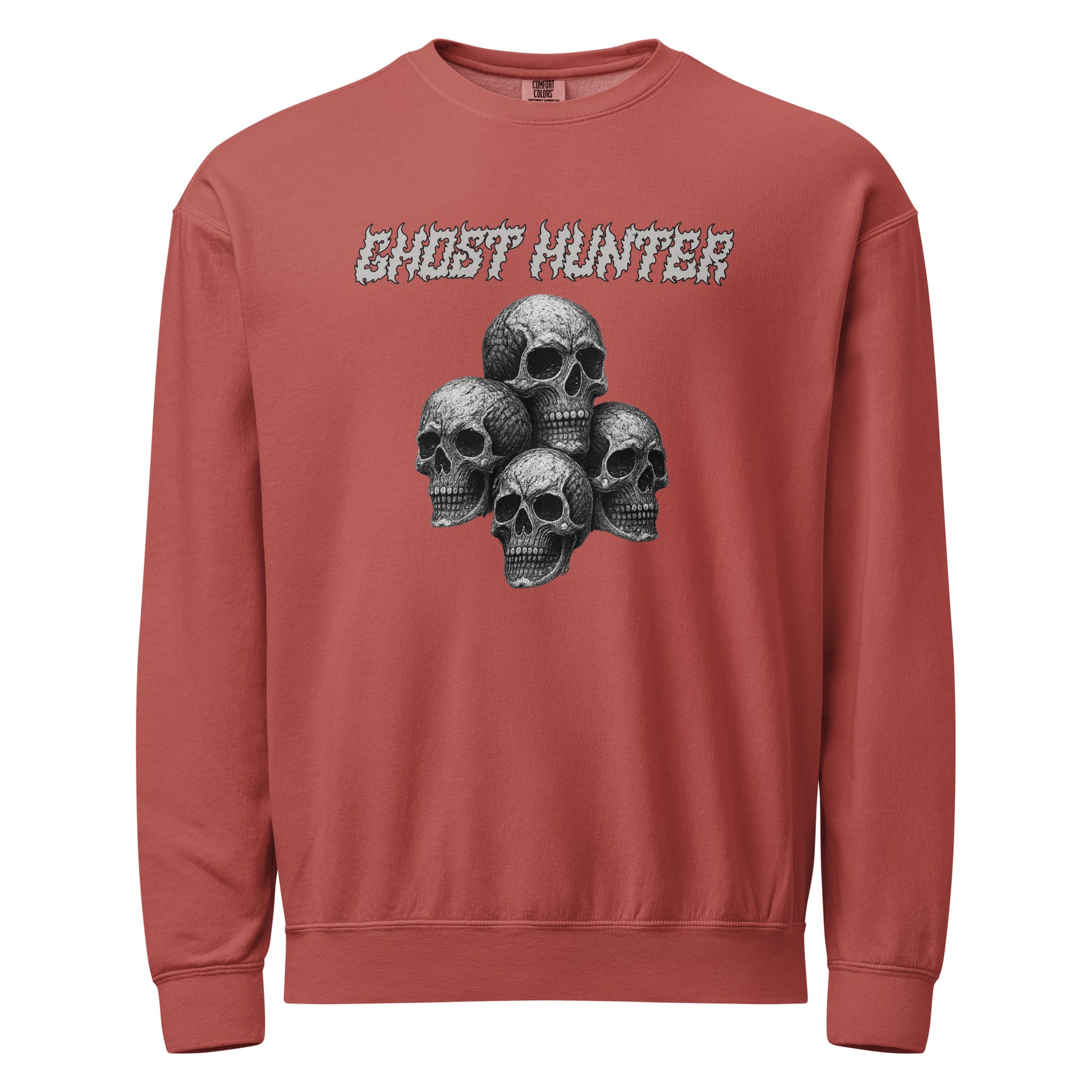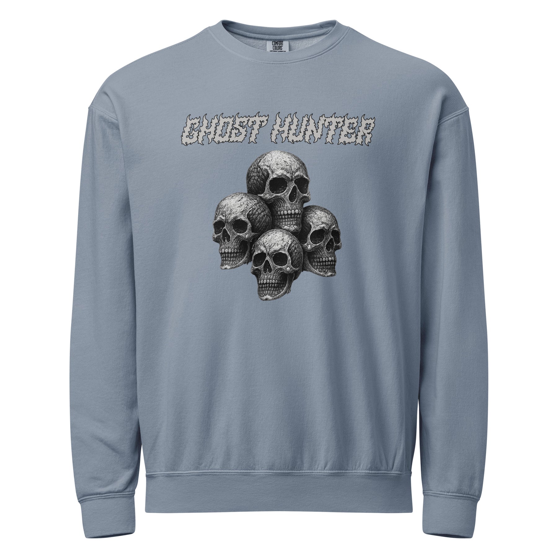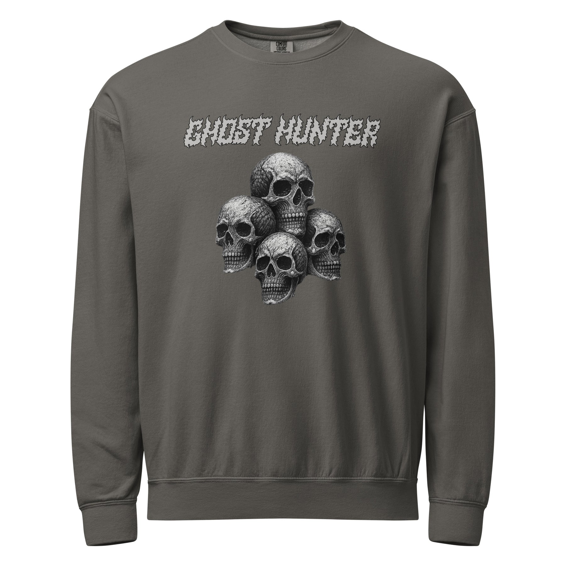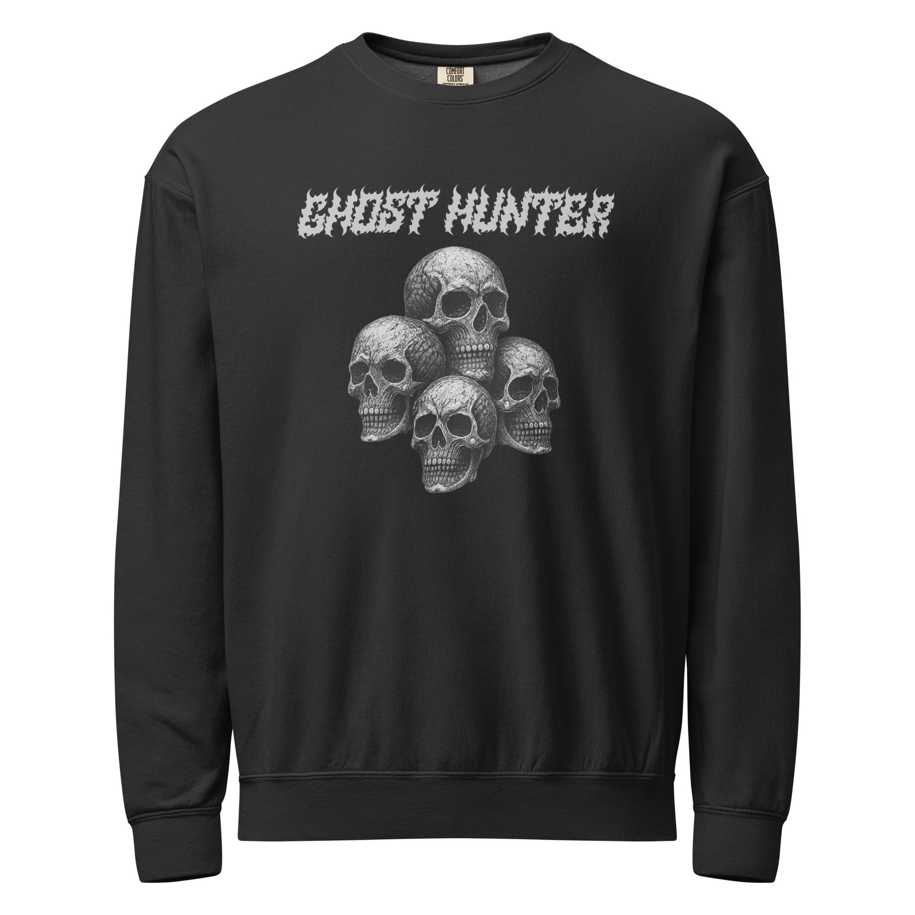 Featuring a bold pile of hand-drawn gothic skulls beneath the words Ghost Hunter, this crewneck captures the raw, black-metal edge of the paranormal world. The artwork is gritty, intense, and unmistakably KGH — perfect for anyone who lives for haunted places, abandoned spaces, and the thrill of the hunt.